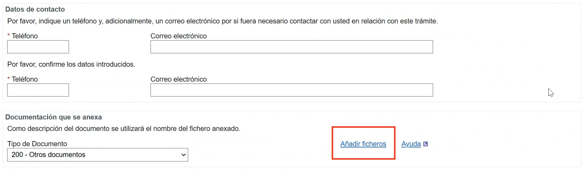 To upload your documents, you can select "200 - Otros documentos" from the dropdown and click on "Añadir ficheros". You will also need to add your phone number and email address twice, to confirm your contact details.